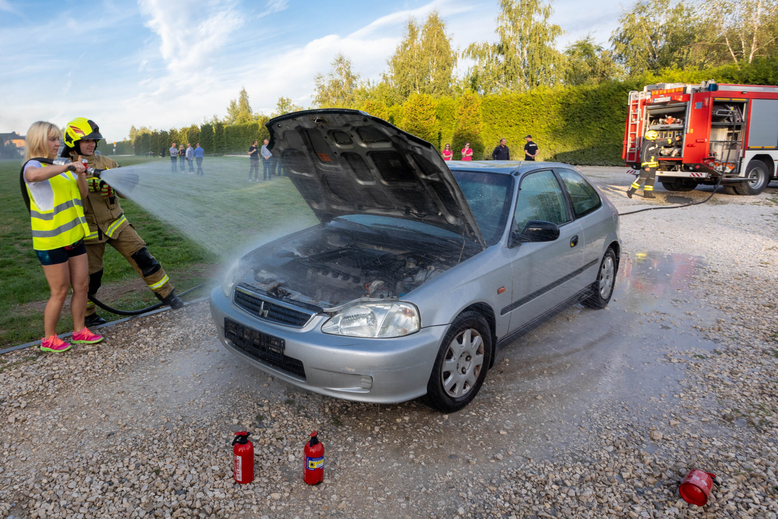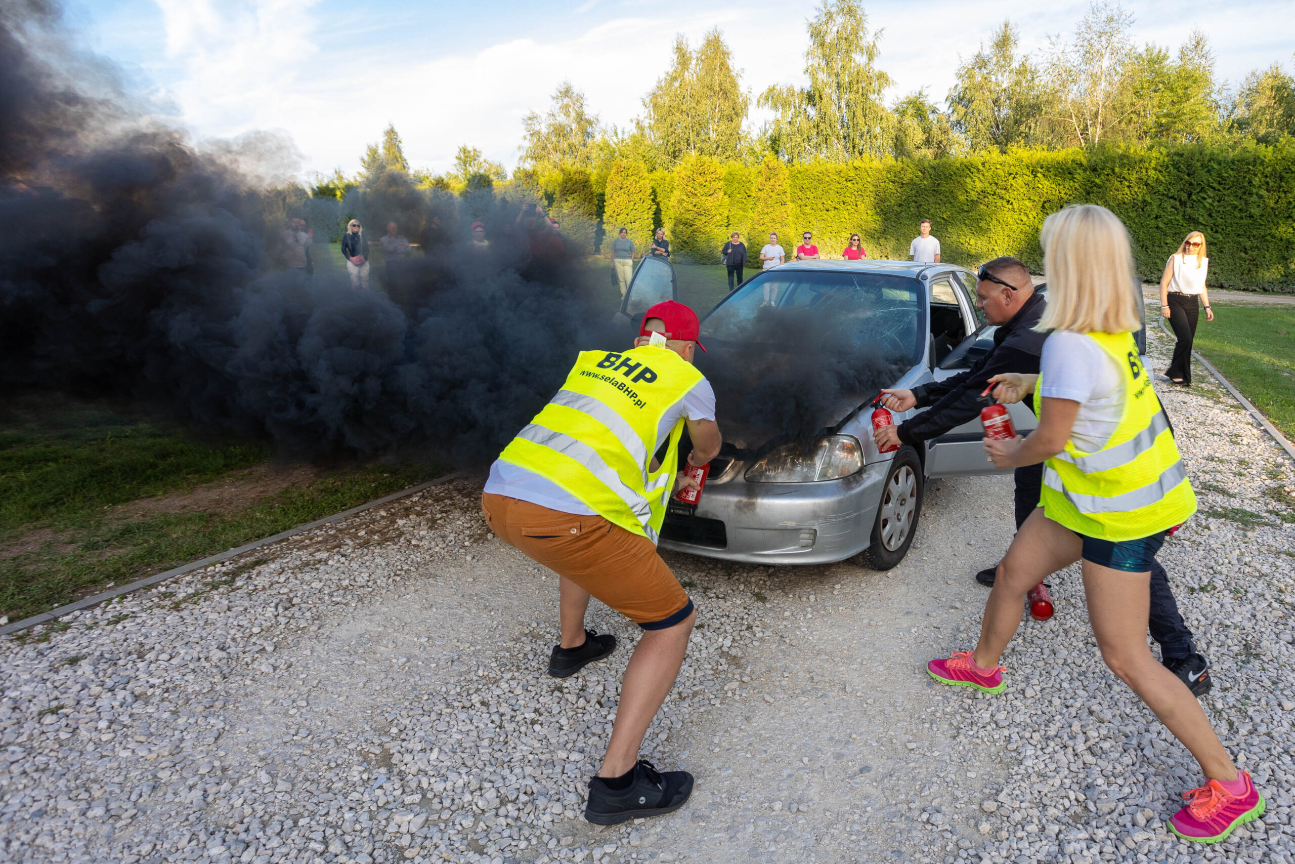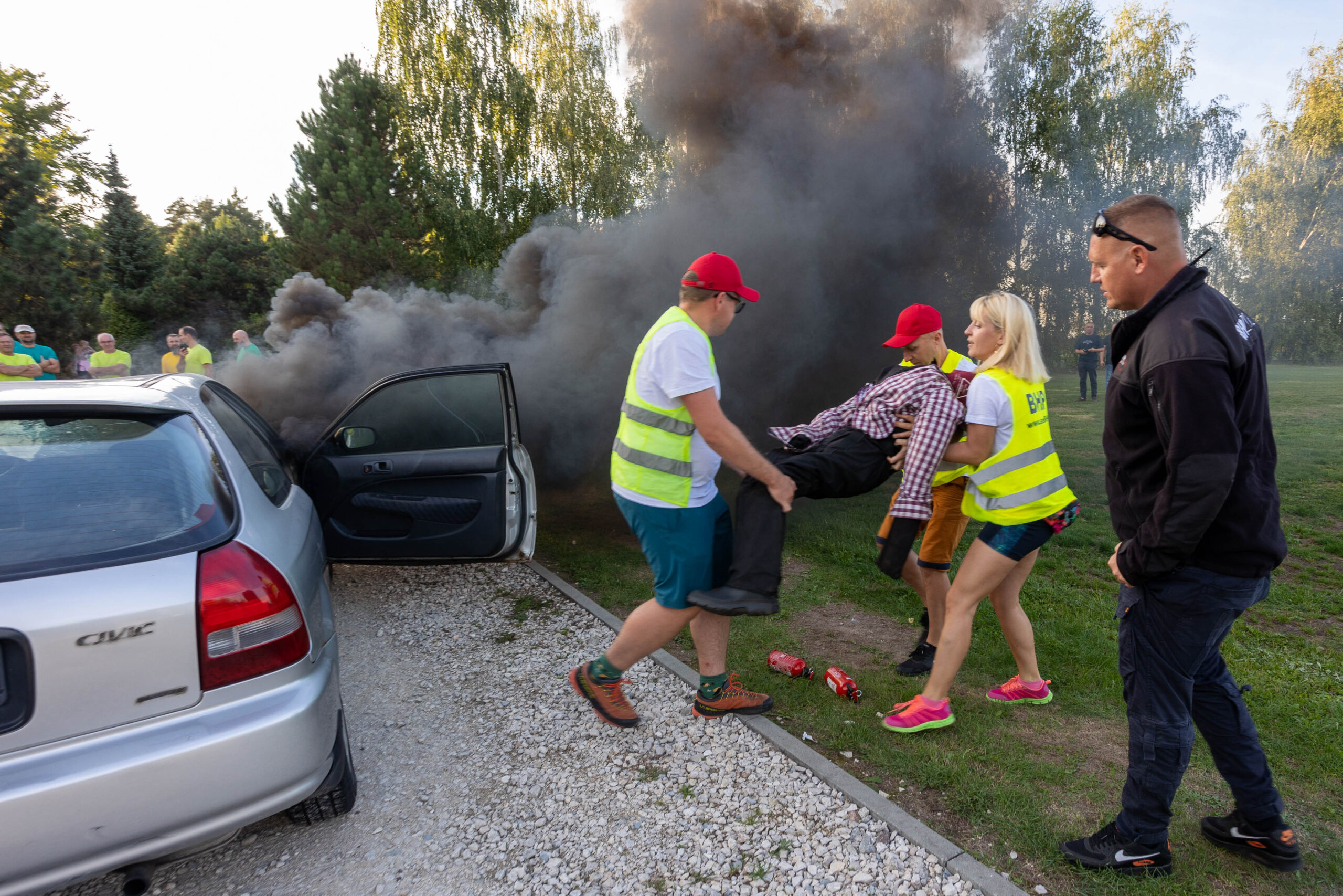 Na tej stacji uczestnicy biorą udział w realistycznym pokazie gaszenia pożaru samochodu. W specjalnie przygotowanym wraku auta demonstrujemy działanie gaśnic samochodowych oraz techniki ich skutecznego użycia – równoczesne podanie trzech gaśnic znacząco zwiększa szanse na opanowanie ognia.