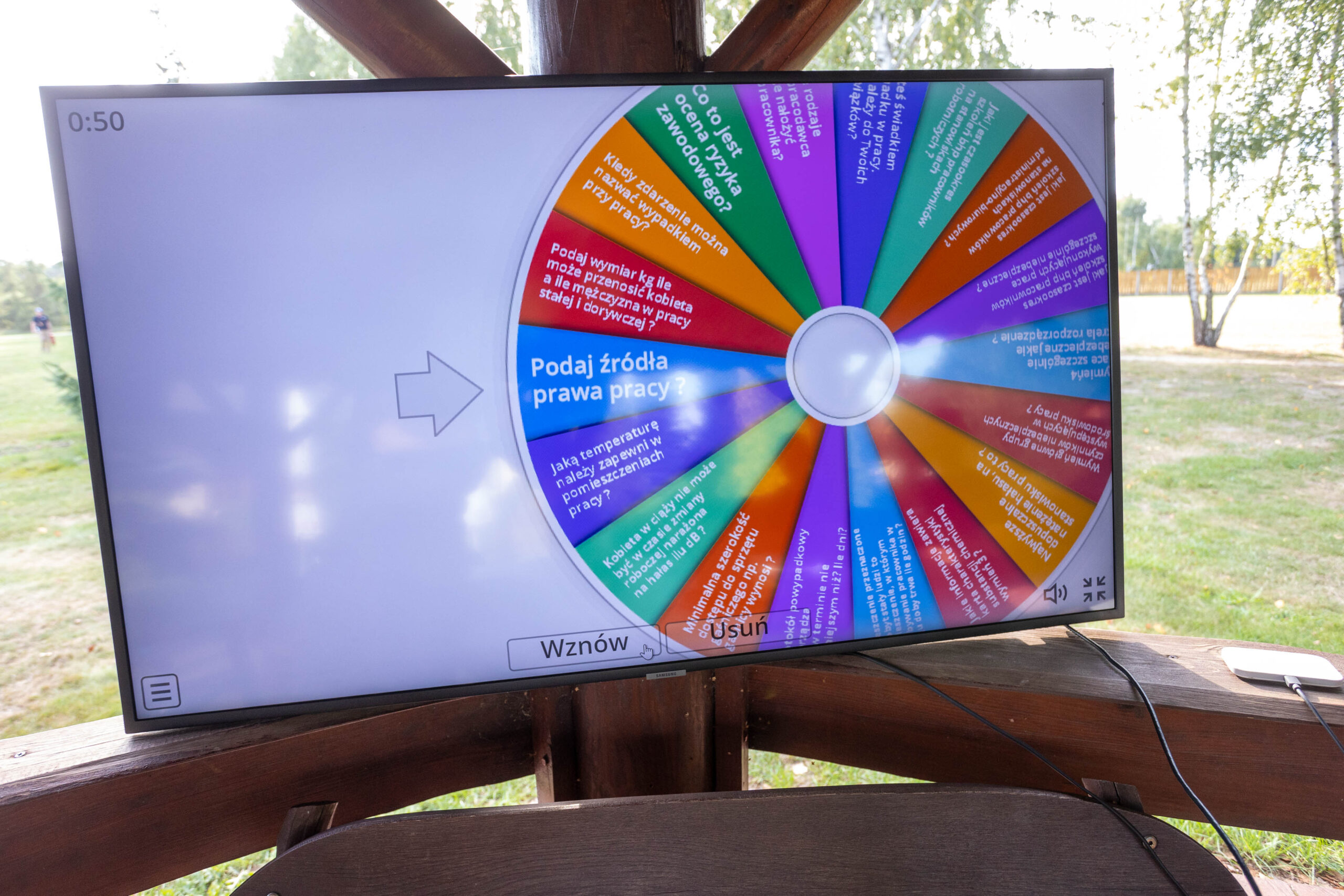 Uczestnicy (indywidualnie lub w drużynach) stają przed ekranem, na którym wyświetlane są pytania z zakresu BHP.