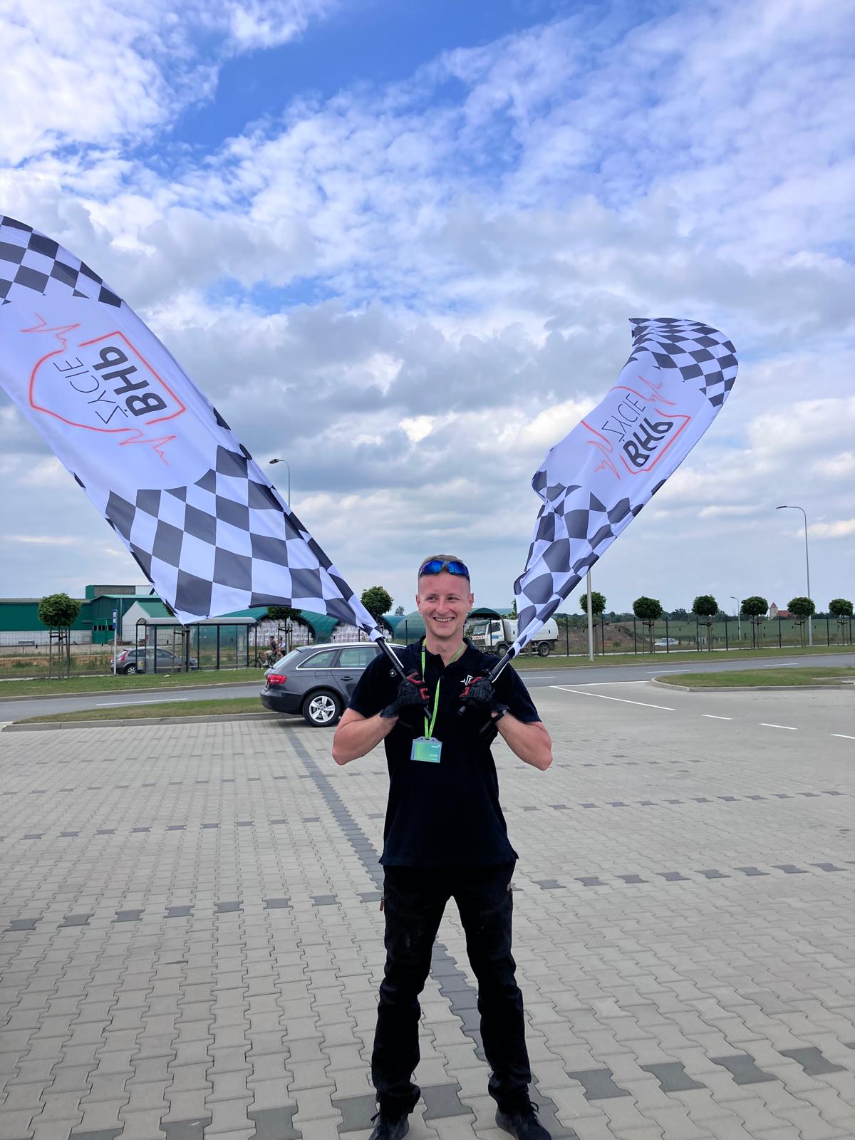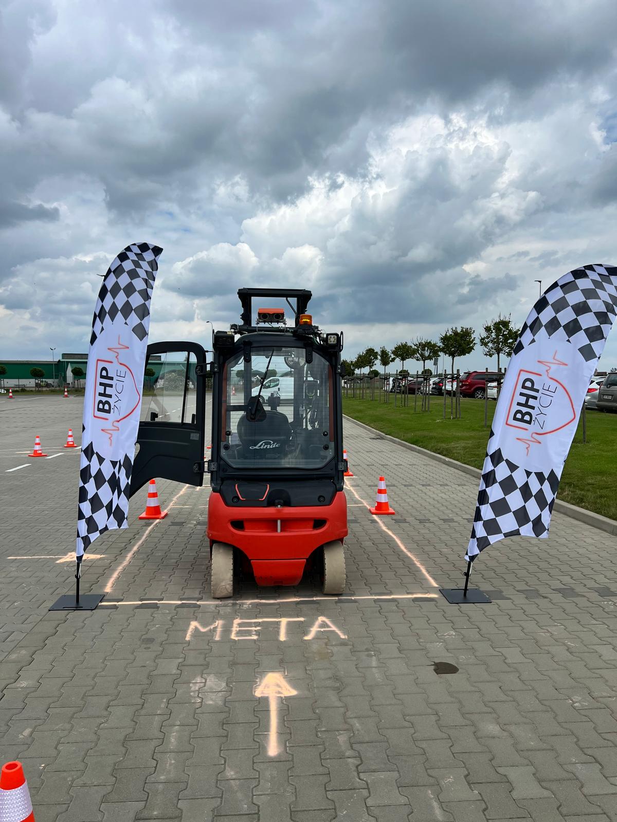 Stanowisko „Wózek widłowy BHP” to zaawansowane ćwiczenie praktyczne na specjalnie przygotowanym placu manewrowym, stworzonym z ponad 80 pachołków i oznaczonym zmywalną kredą w sprayu. Celem zadania jest bezpieczne i precyzyjne wykonanie serii manewrów wózkiem widłowym.